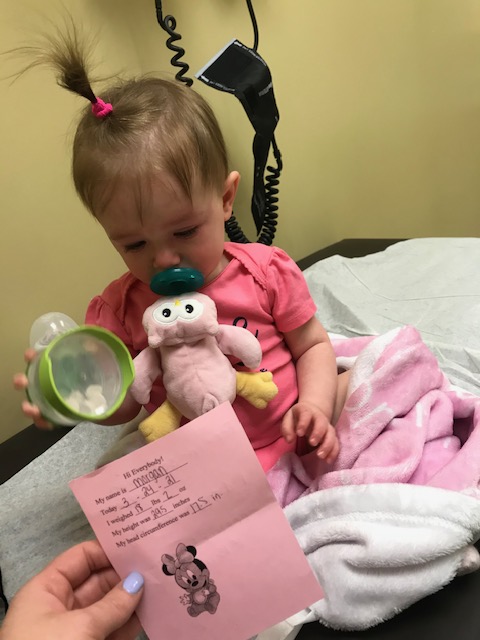 At this visit, they pricked her big toe to check her iron levels, and also check for lead. Her lead test came back normal, but the iron came back low, so they came back in and pricked her a second time. Cue tears from both of us. After the Nurse Practitioner read the results, she explained that Morgan’s iron is slightly low. They like to see it measure 11 and above, and her two readings were 10.6 and 10.7. She recommended we start Morgan on a daily iron supplement called Fer-in-sol. After thinking about it, I remembered that was low in iron during my pregnancy and had to take a supplement to boost. My mom said that I also was low as a baby, and had to take a liquid iron supplement that tasted and smelled gross! I guess Morgan is following her mama’s footsteps on this one.