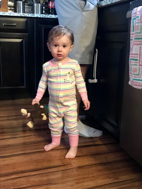 These days Morgan is more formula fed than breastmilk-fed (as I am weaning from pumping) and we are beginning to mix in organic whole milk to ease the transition. She is becoming less and less interested in milk overall, and focusing on eating more foods. Right now some of her favorite foods are pasta (of any shape and sauce!), black beans, strawberries, deli turkey, hot dogs, and chocolate. We also mix in some organic pouches (Plum & HappyTot are our favorite brands) to make sure she’s getting enough protein, fiber, and vitamins.