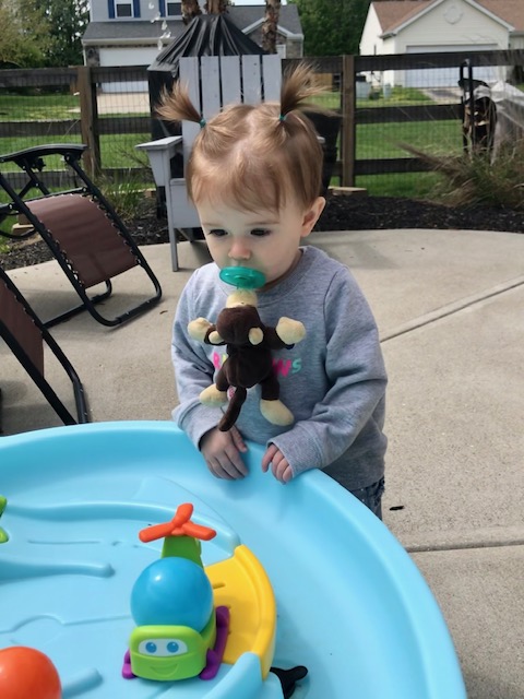 More than anything though, she LOVES to be outdoors. She loves playing with her water table, blowing bubbles, taking walks, and taking rides down the sidewalk in her cozy coupe. For Easter she got lots of sidewalk chalk, and I’m excited to show her how to draw on the sidewalk. We also got her an inflatable pool for her birthday, which will soon add to our little backyard oasis.